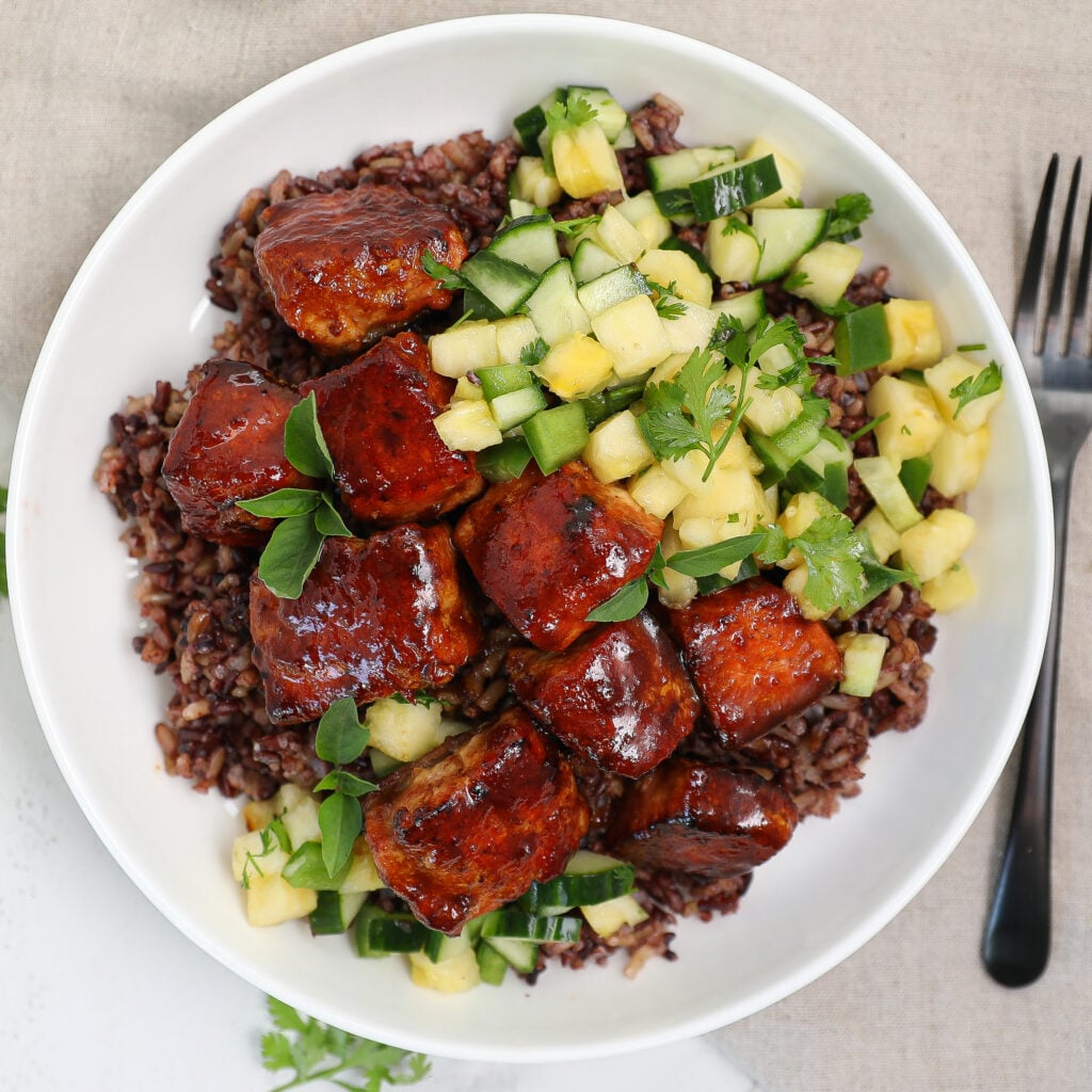 Korean BBQ Crispy Salmon Bowl with Pineapple Salsa