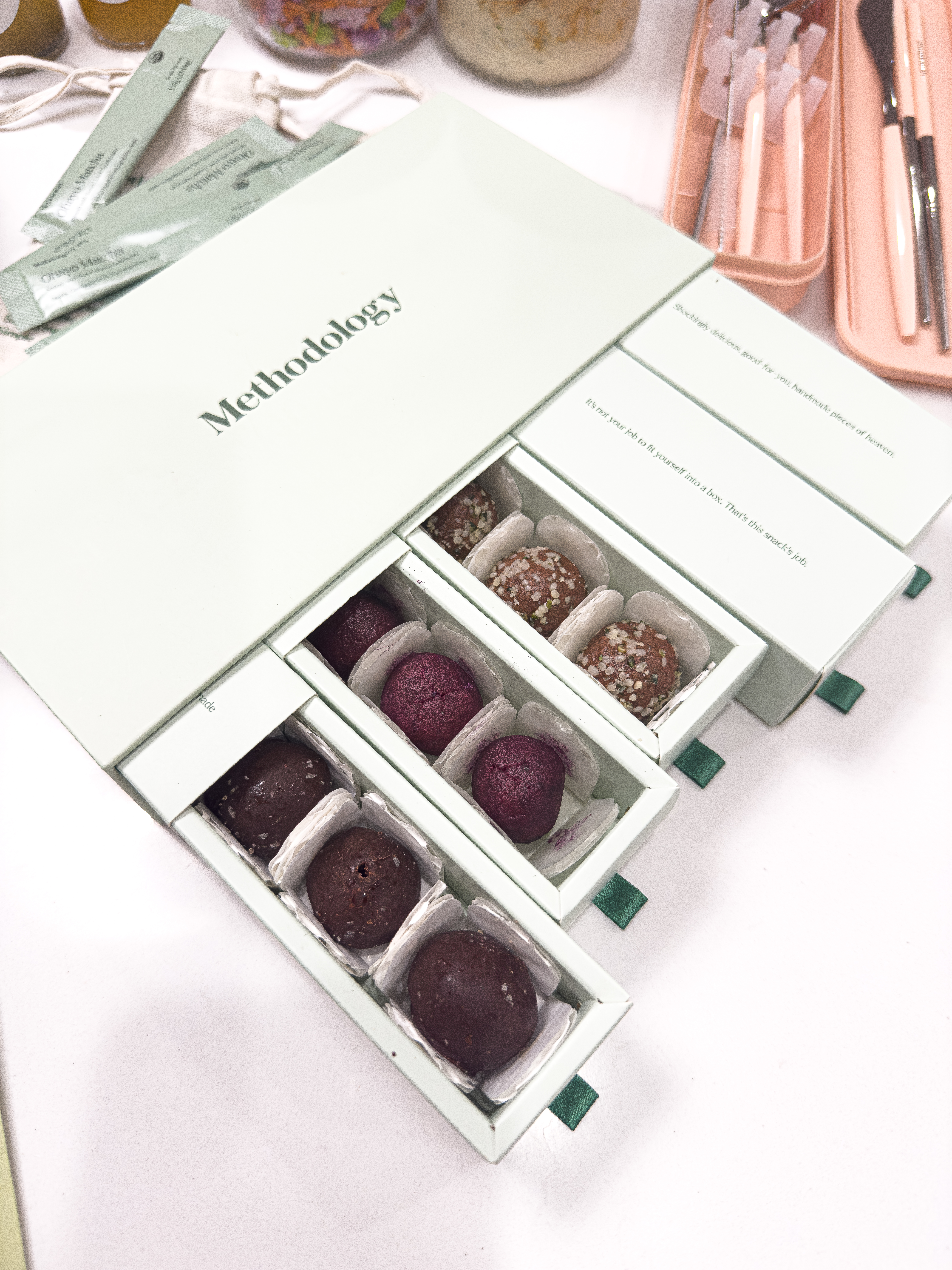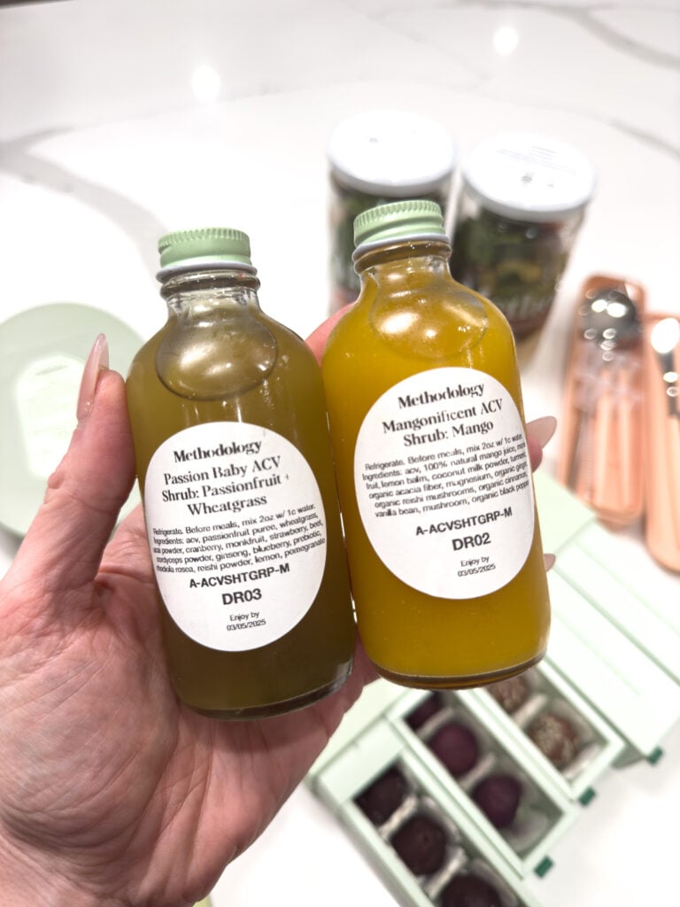 Meals, apple cider vinegar shrubs, and protein truffles should go in the fridge. The matcha sachets can stay in your pantry.