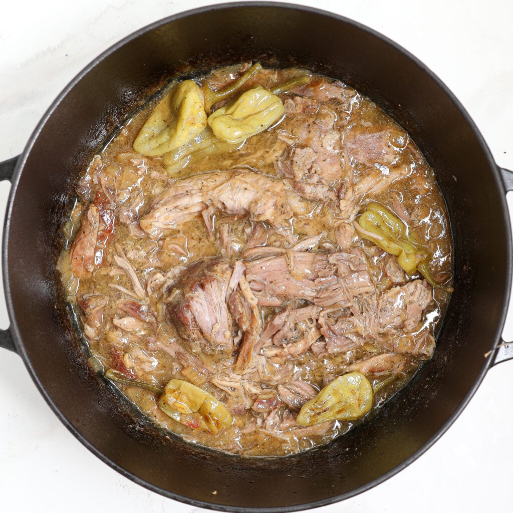 - Once the pork is done, remove it from the Dutch oven and set it aside.