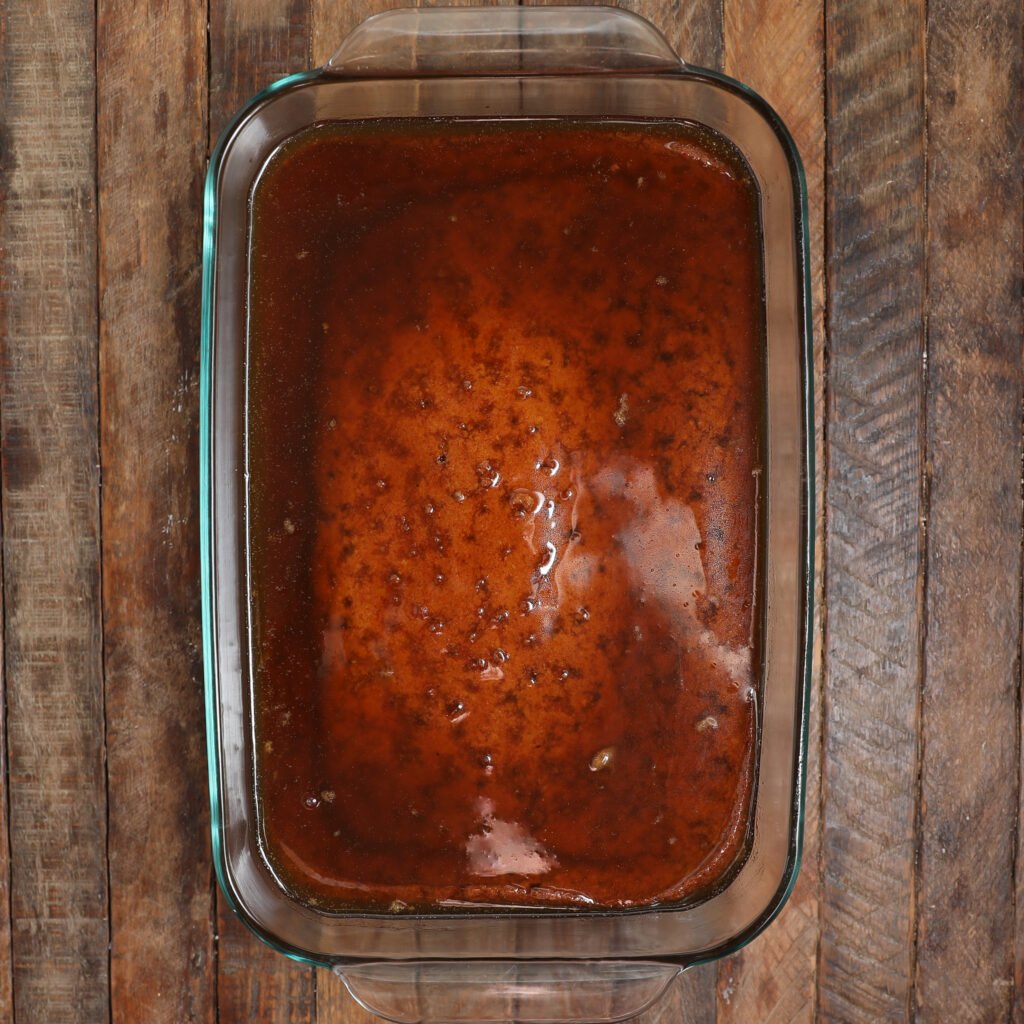 - Pour the prepared toffee sauce over the cake, ensuring it soaks into the holes.