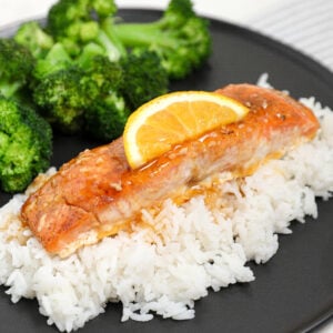- Serve: Remove the salmon from the oven, spoon additional glaze over the top, and serve with rice and broccoli for a complete meal. Enjoy!