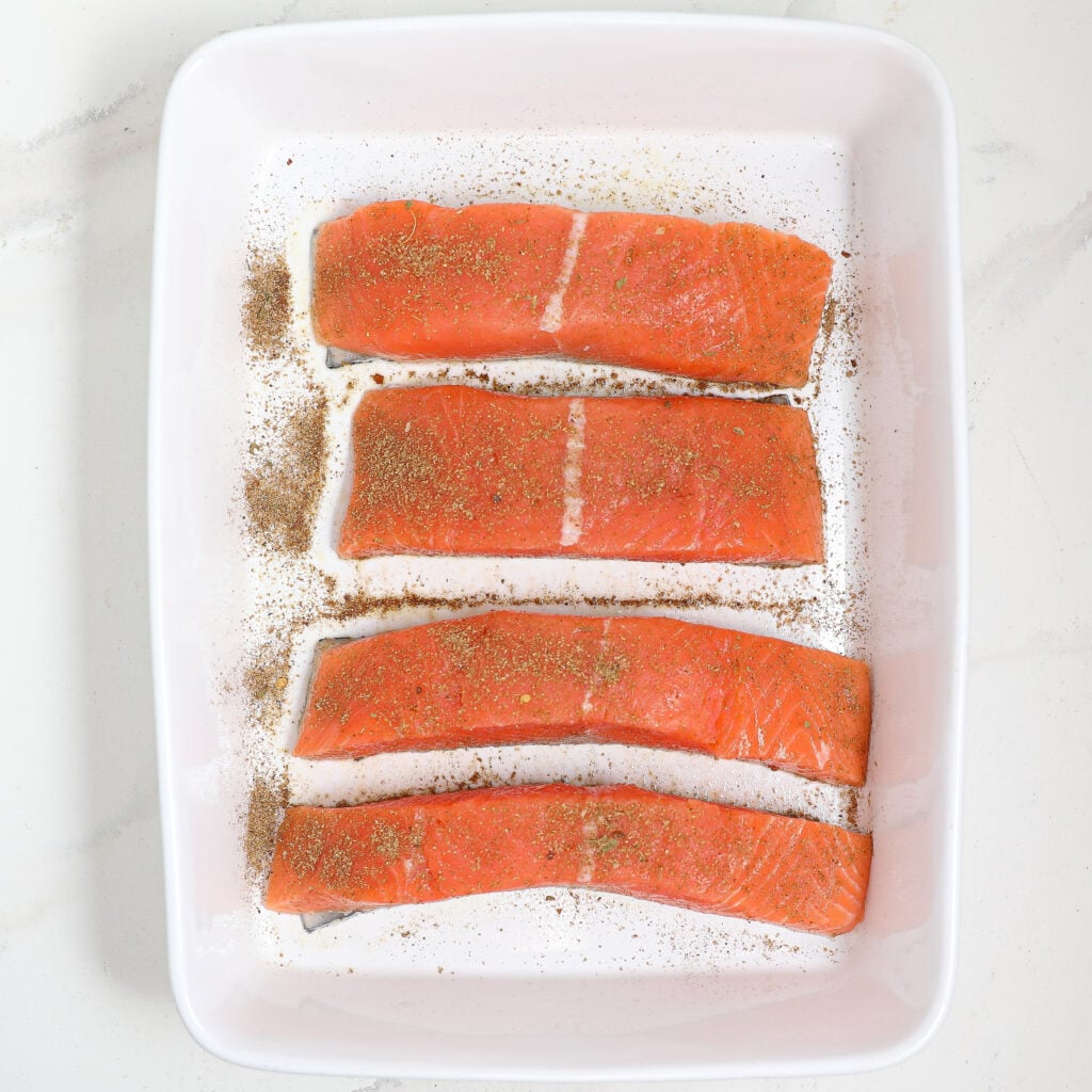 - Prepare the Salmon: Spray a 9×13 baking dish with nonstick spray. Place the salmon filets in the dish and pat them dry with a paper towel. Sprinkle the Jamaican seasoning evenly over the salmon.