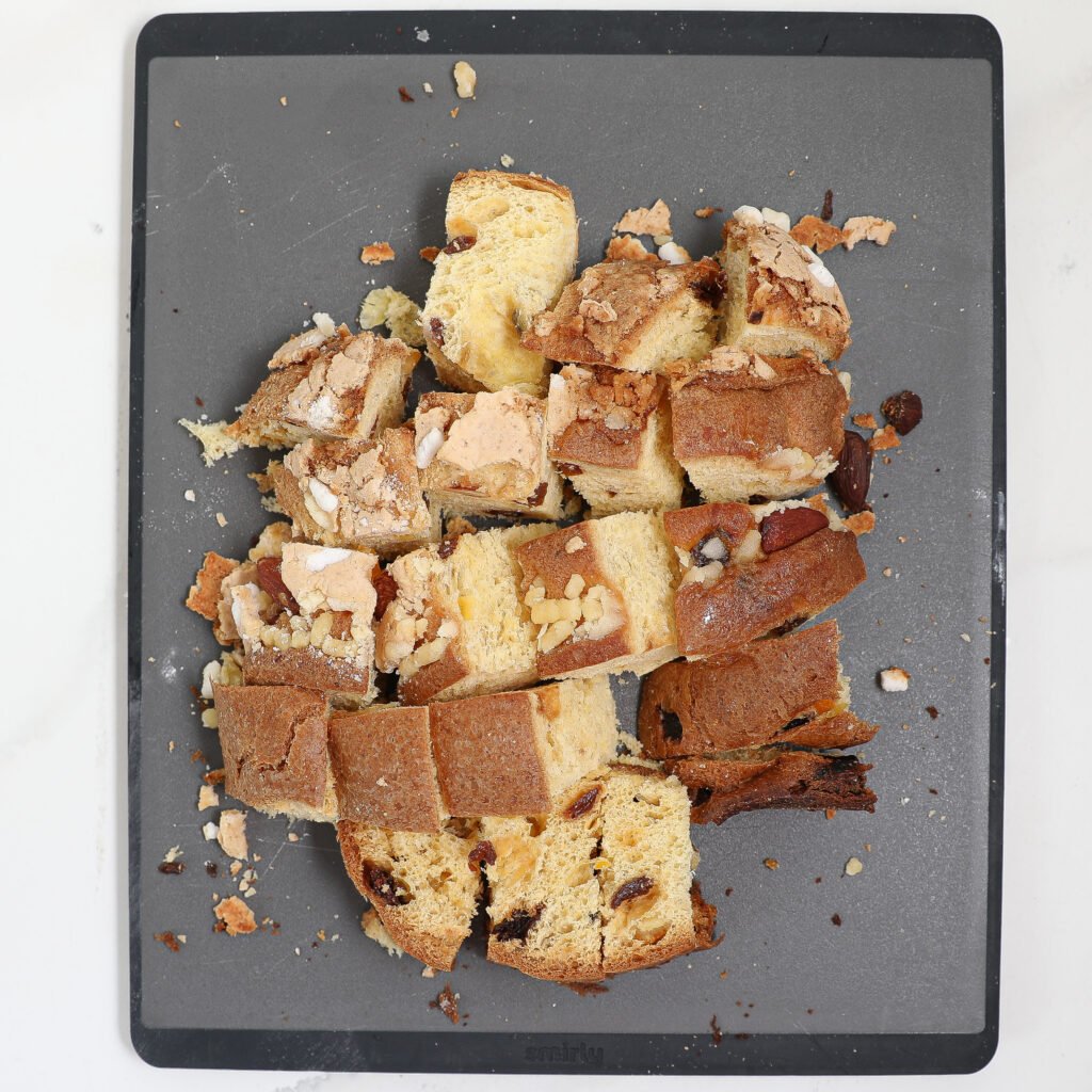 - 1 Panettone cubed into 1” pieces