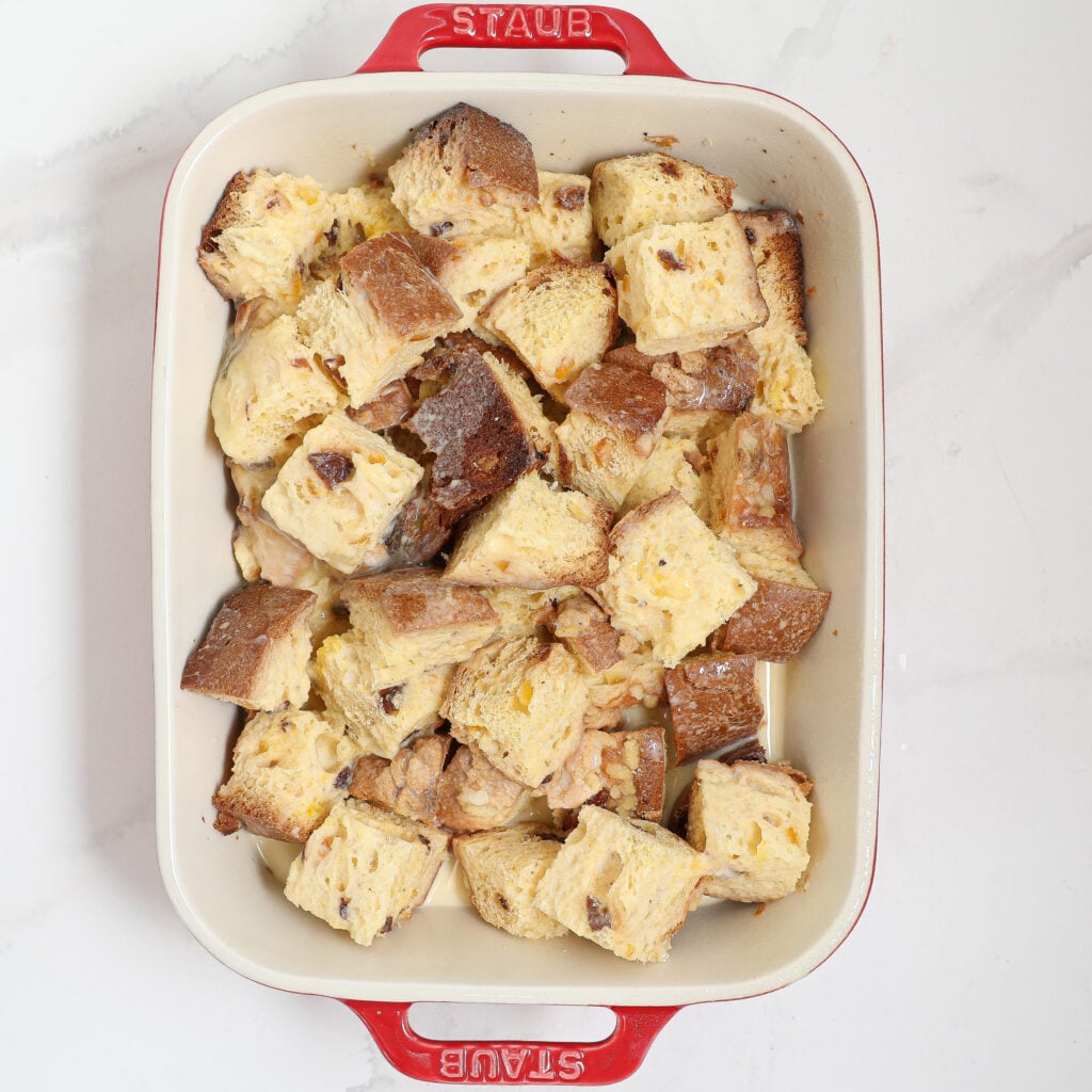 - Add the cubed Panettone to the prepared baking dish. Pour the egg mixture evenly over the bread cubes, ensuring all pieces are soaked.