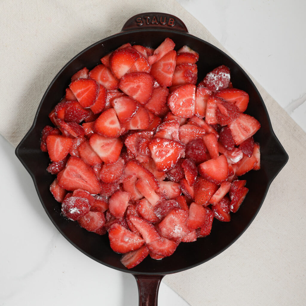 - Toss the strawberries with sugar and cornstarch, then spread them in the bottom of the dish.