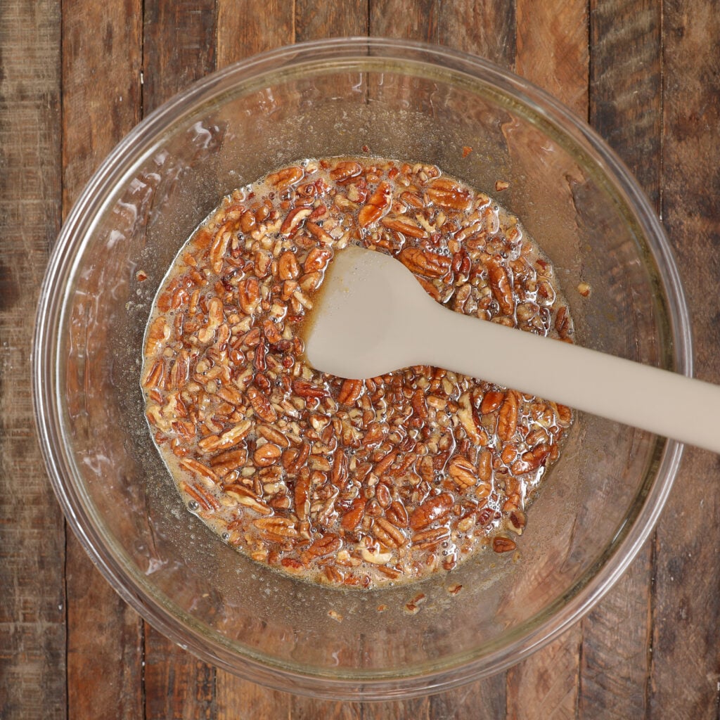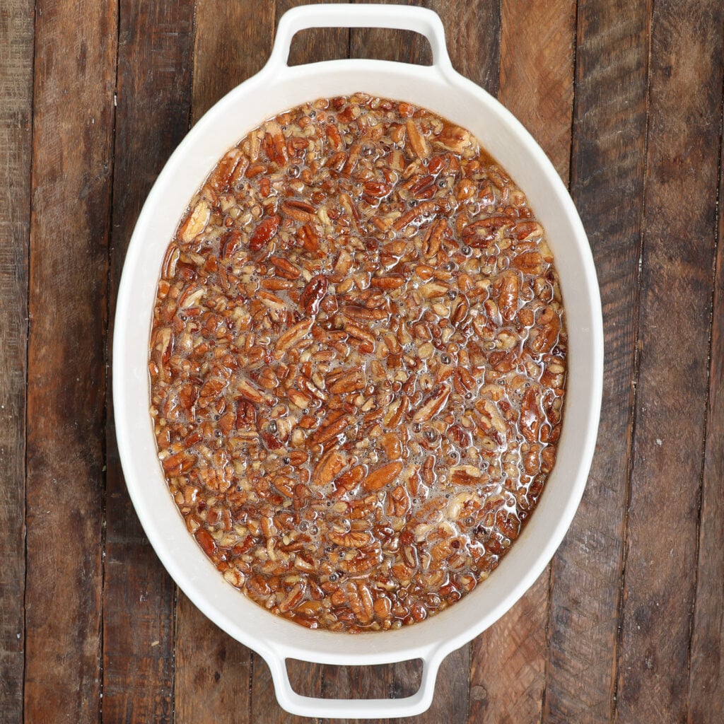 - Mix the ingredients for the pecan pie filling and pour it into the dish.