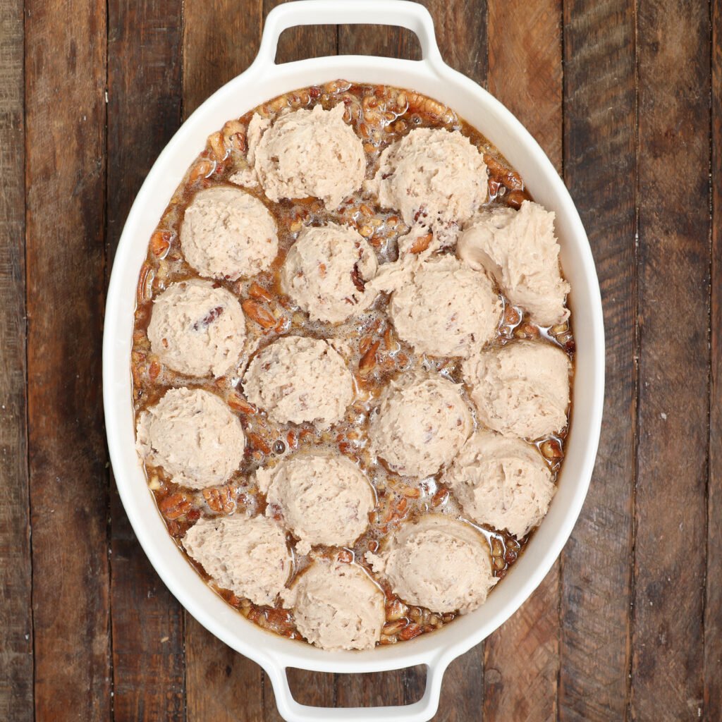 - Scoop equal-sized portions of the cobbler dough on top of the pecan pie filling.