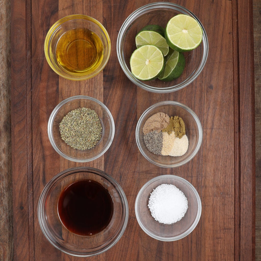 - Prepare the marinade by mixing together all the ingredients for the chicken (coriander, salt, black pepper, garlic powder, onion powder, cumin, lime juice, olive oil, oregano, and soy sauce) in a large container.