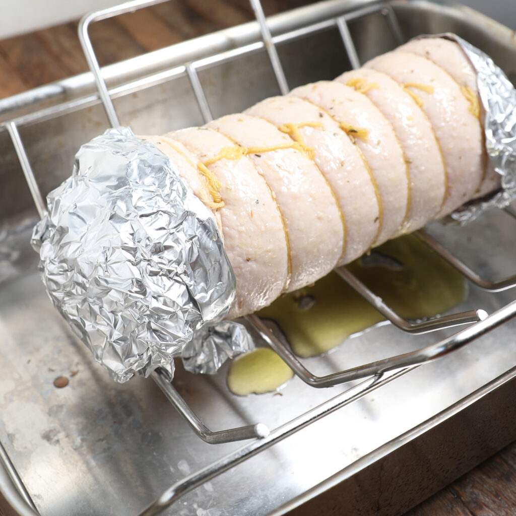 - Roll it up tightly, secure it with twine, and place it in a roasting pan.