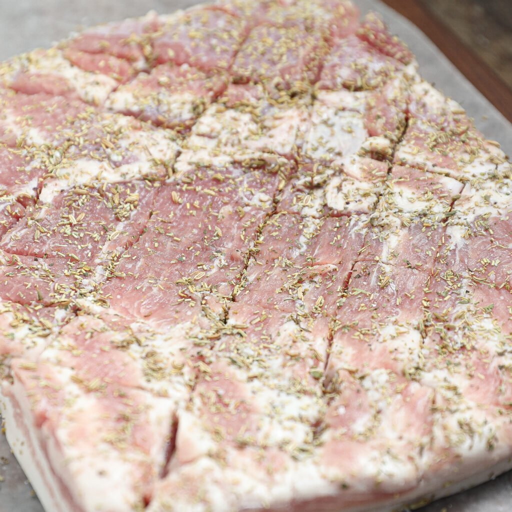 - Season the pork belly with herbs, garlic, and spices.