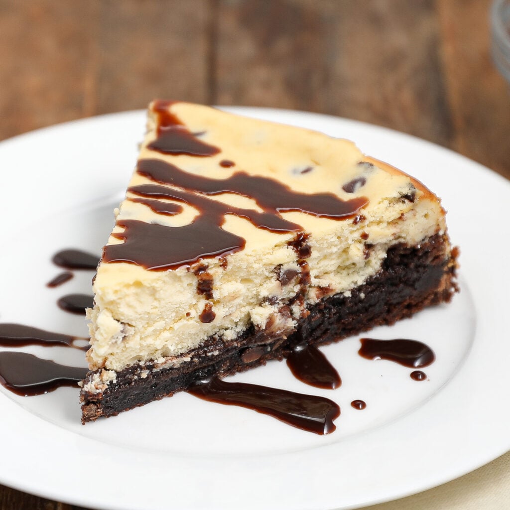 - Remove the cheesecake from the springform pan, drizzle with chocolate, slice, and enjoy!