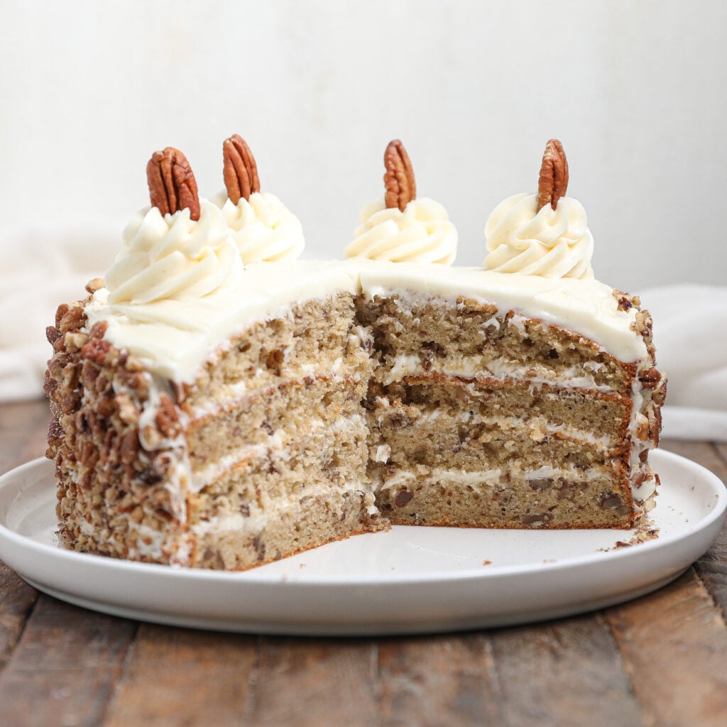 Yes, you can substitute walnuts or almonds if you prefer. Just keep in mind that the flavor and texture of the cake will change. Pecans add a unique buttery richness that complements the cake beautifully, but other nuts can work well too.
