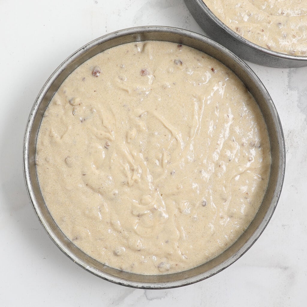 - Divide the batter between the two pans and bake until a toothpick comes out clean.