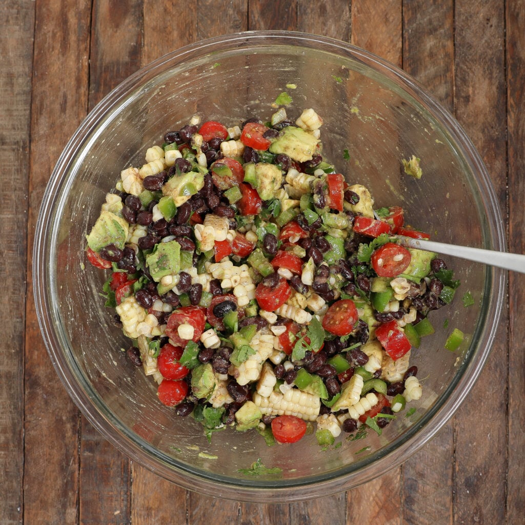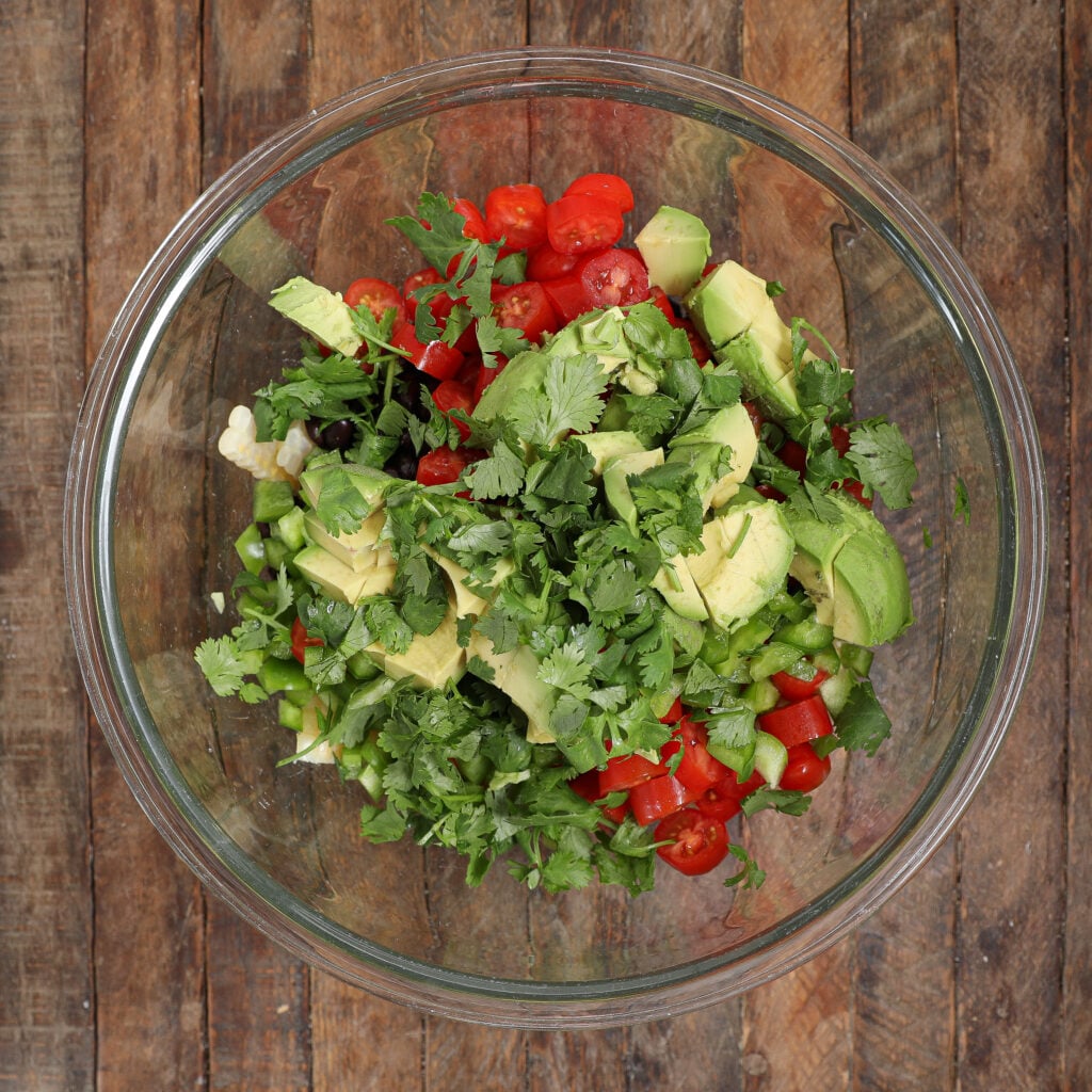 - Combine the Salad: Toss together the chopped tomatoes, avocados, green pepper, corn, black beans, and cilantro in a large bowl.