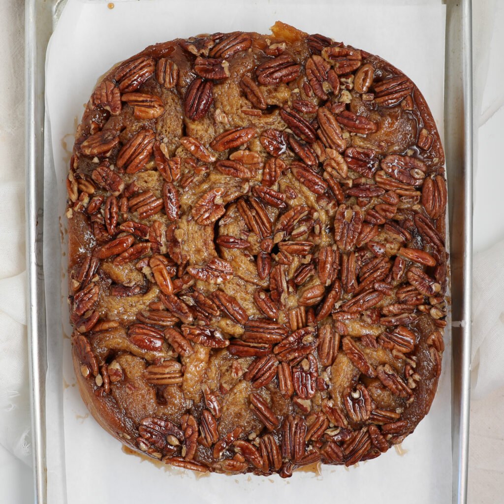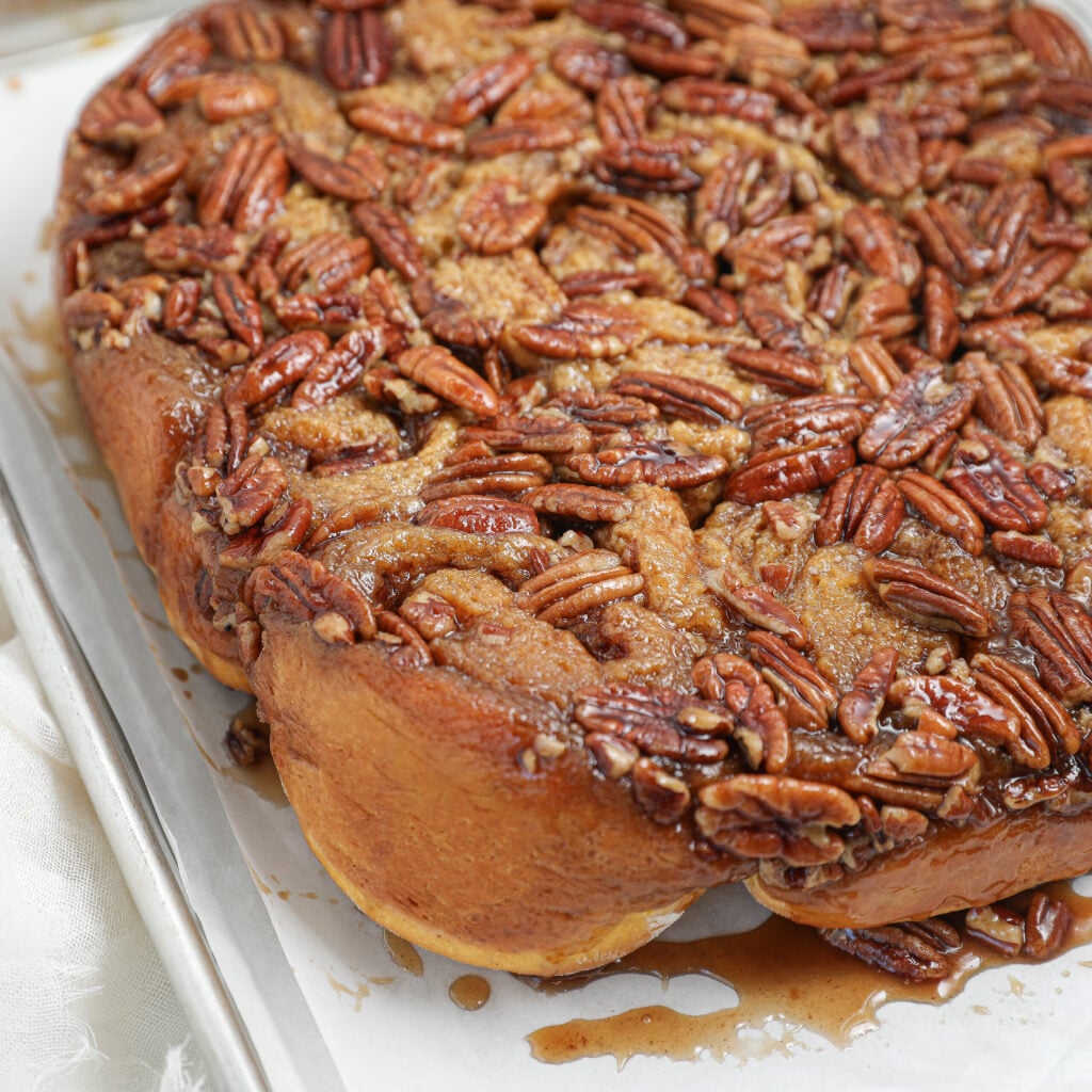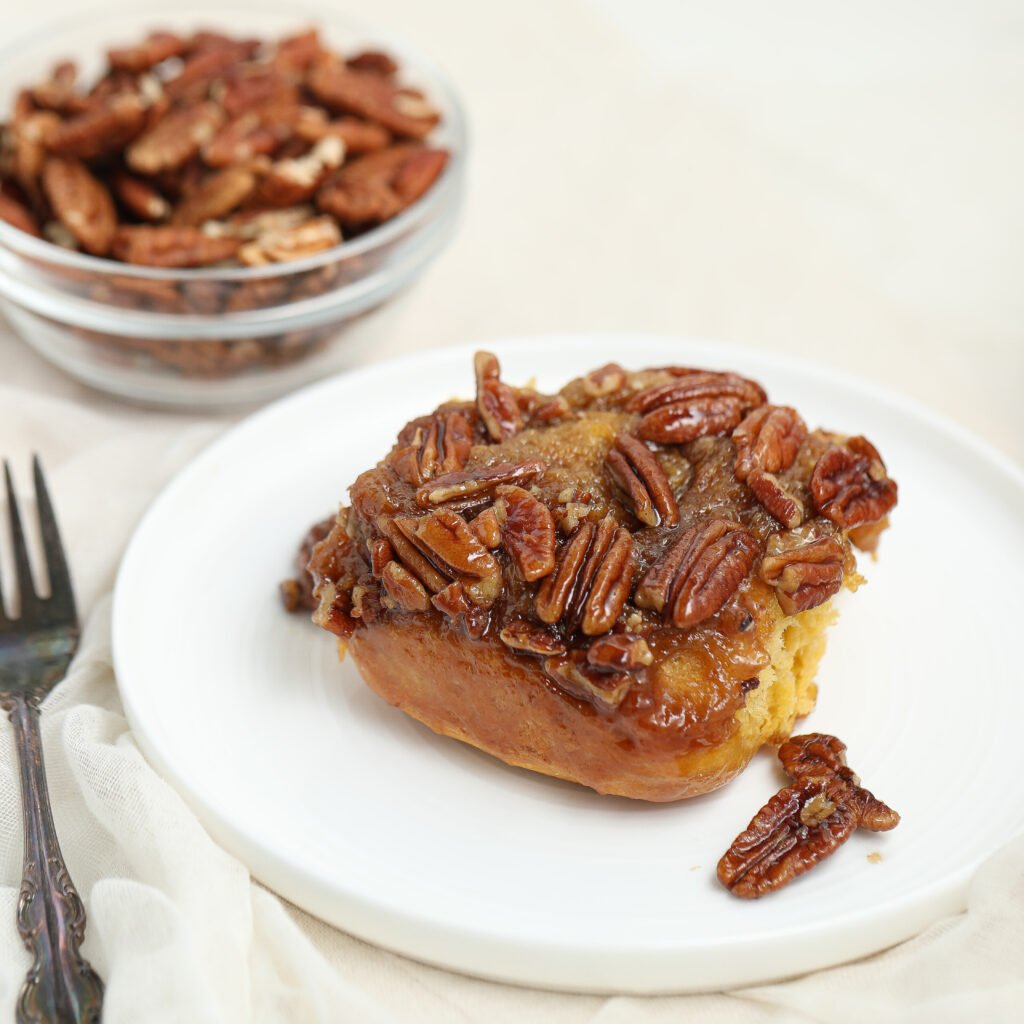 They take a little time to rise, but it’s mostly waiting while your kitchen fills with the scent of warm sugar and spice. When you flip them out of the pan, you get soft rolls coated in sticky caramel and toasted pecans. They’re simple, cozy, and totally worth it!