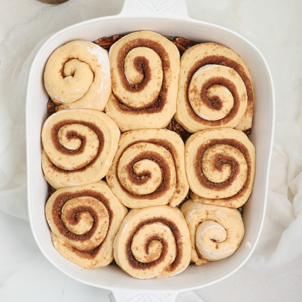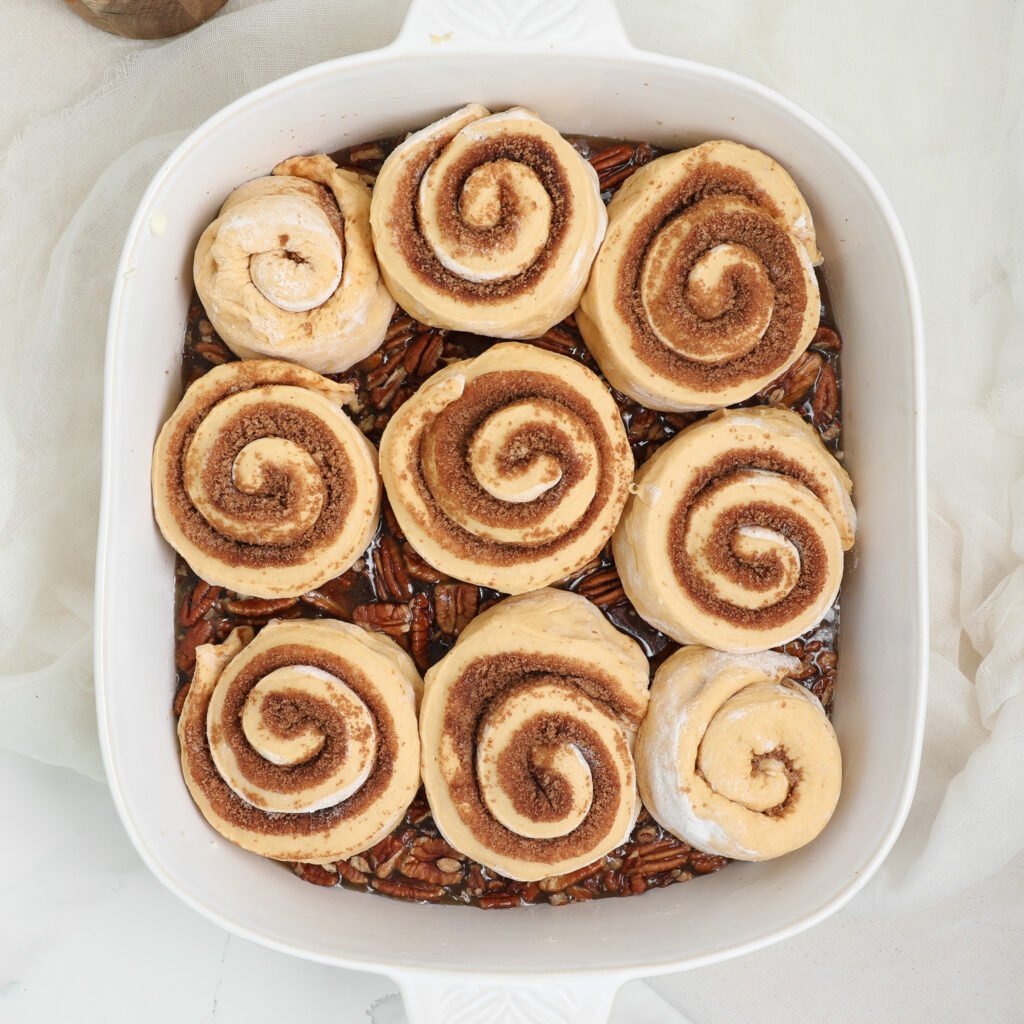 - Cut into 9 even rolls and place them cut side down on top of the pecan base mixture in the baking dish.