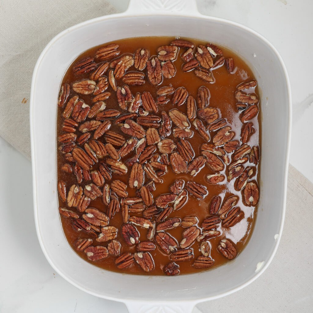 - Prepare the topping: In a small saucepan, heat butter over medium heat. Stir in brown sugar, maple syrup, and salt until smooth. Pour into a buttered baking dish and sprinkle chopped pecans evenly across the surface.