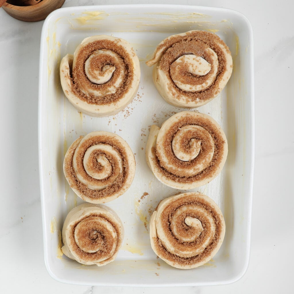 - Mix brown sugar and cinnamon in a small bowl. Butter your 9×13 baking dish so the rolls don’t stick.