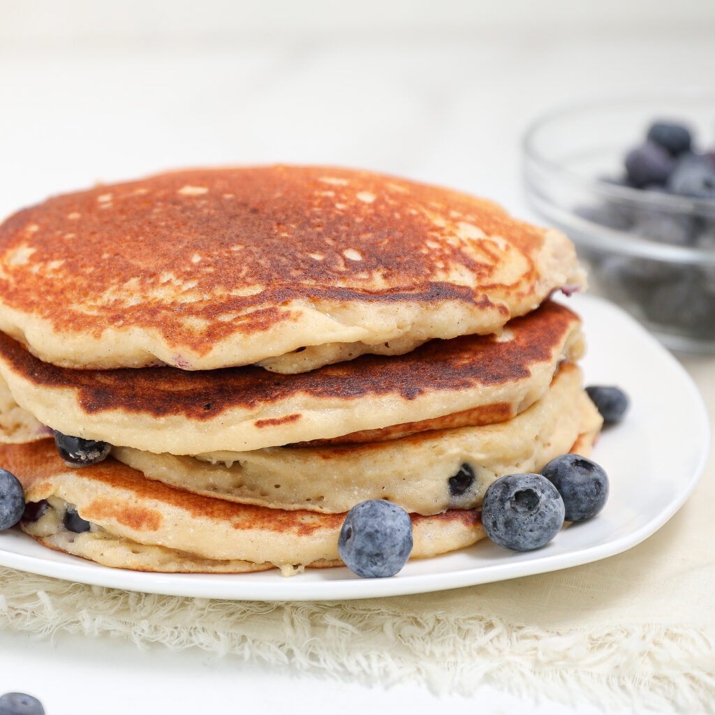 Yes, you can! Frozen blueberries work well, but you don’t need to thaw them beforehand. Just toss them directly onto the batter while cooking to prevent them from bleeding into the pancakes too much.