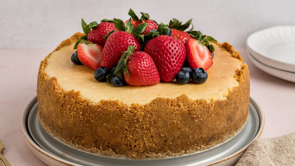 The cheesecake isn’t done in the traditional sense of being fully baked through like a cake. Here are two signs to tell if your cheesecake is ready: