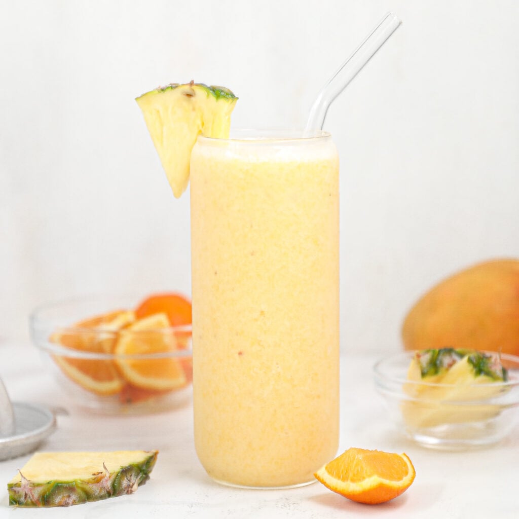 This Tropical Smoothie is everything I want on a hot day! It’s cold, creamy, and loaded with fresh fruit flavor. It comes together fast with banana, mango, orange, and a splash of Lakewood Organics Pineapple Juice, which gives it that sweet, tangy kick that makes it taste like sunshine in a cup. I love making a big batch for parties or just blending up a quick one for myself when I need a break-from-reality kind of snack. If you’re prepping ahead, blend everything but the ice and toss that in just before serving to keep it perfectly frosty.