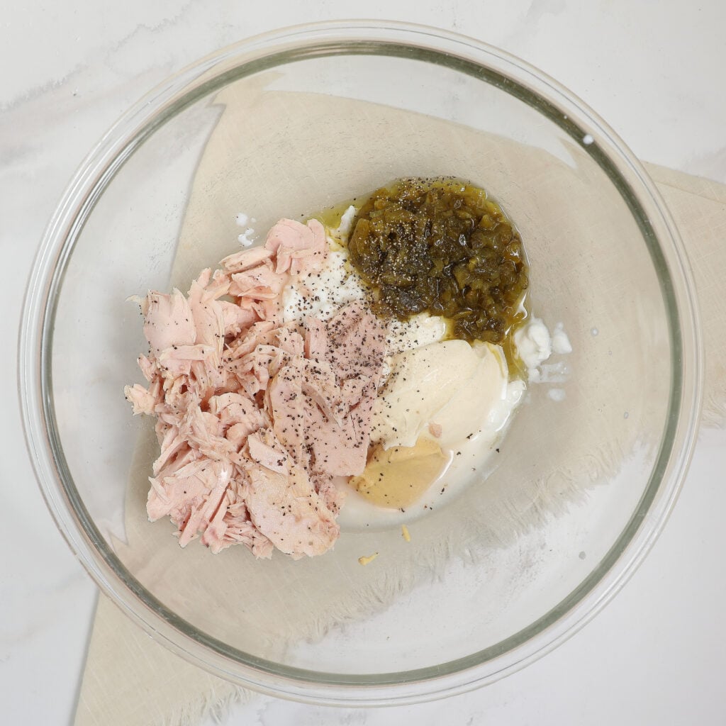 - In a large mixing bowl, combine the tuna, Greek yogurt, salt, pepper, lemon juice, relish, mustard, and mayonnaise. Mix until well combined.