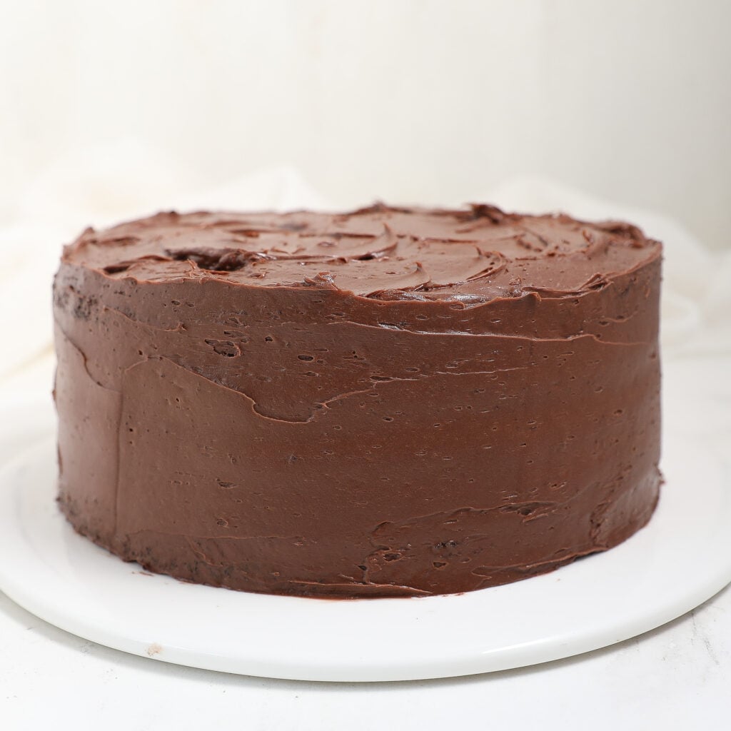 - Once the cakes have cooled completely, frost the top of one layer with the chocolate buttercream. Place the second cake layer on top and frost the entire cake, including the sides.