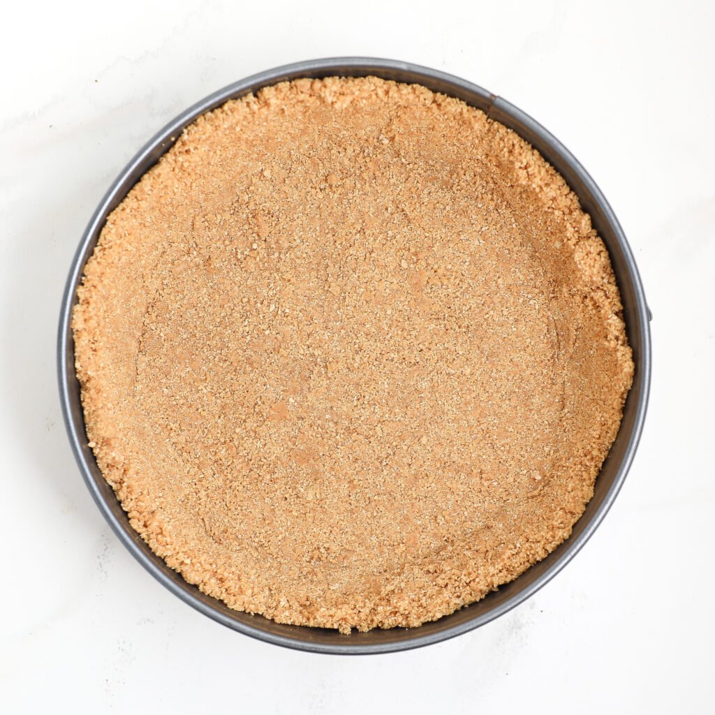 - Make the crust by mixing graham cracker crumbs, and melted butter. Press it into the pan and chill it while you prep the filling.