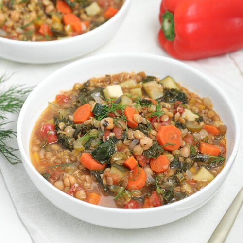 The lentils and chickpeas make it hearty without being heavy, and the potatoes help thicken the broth as it cooks so it lands somewhere between soup and stew. I add the zucchini and kale at the end so they stay tender, then finish it with dill for a fresh pop that pulls everything together. It’s simple, comforting, and one of those meals I always come back to.