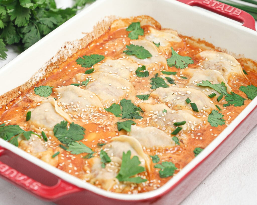 On the premade side, this recipe turns a bag of frozen dumplings into something that looks and tastes much more intentional. No thawing, no pan-frying in batches, just nestle them into the sauce and let the oven do the work. It’s flexible enough for weeknights but still feels fun and a little special, especially with all the toppings on the table so people can finish their bowls how they like.