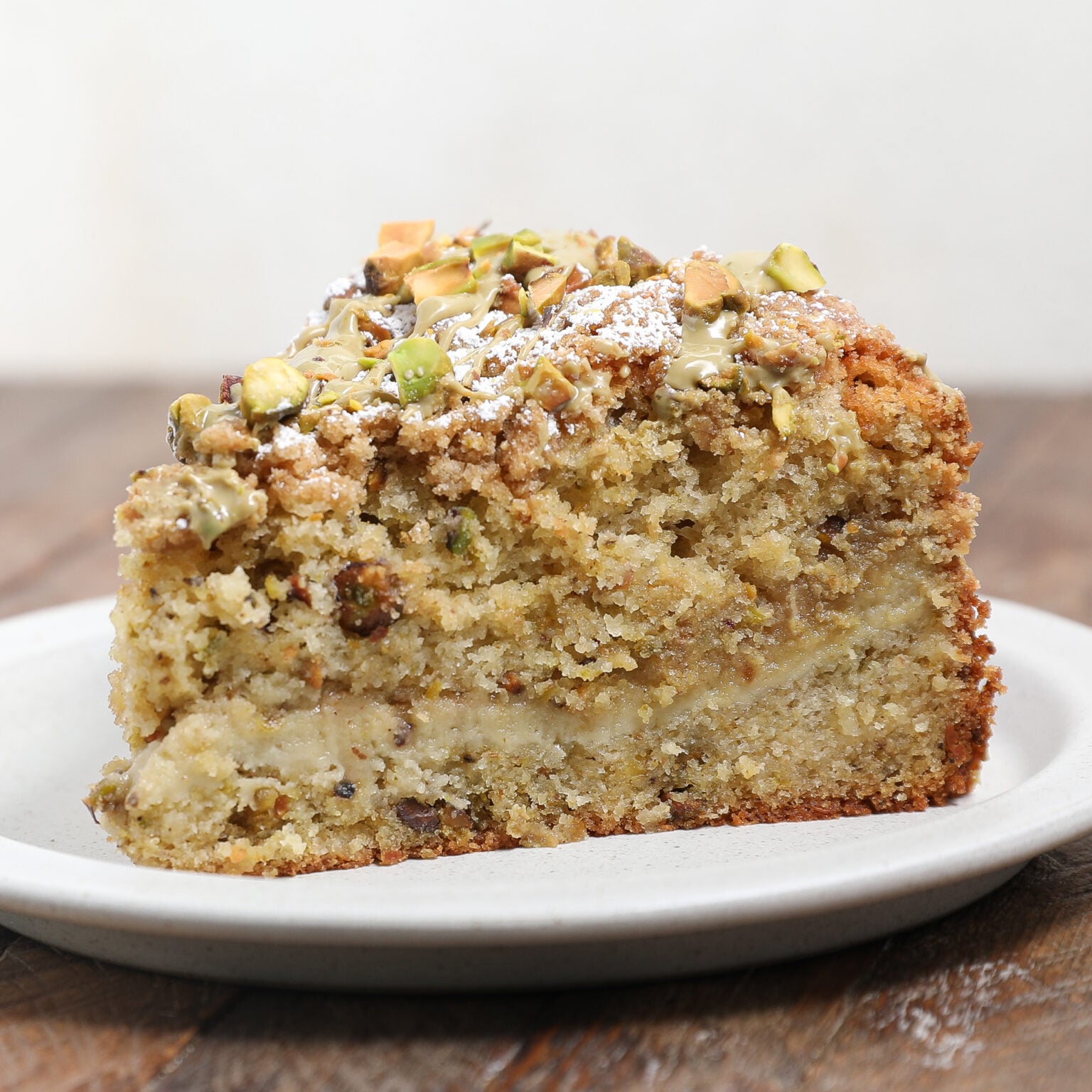 For the Cake – 2 cups 1.1 GF flour or all-purpose flour – 4 tsp baking powder IF USING: All purpose flour, reduce to 2 TSP – ½ tsp baking soda – ½ tsp kosher salt – 2 large eggs – ⅔ cup sugar – 1 ½ cups sour cream – 1 cup butter room temperature – 2 tsp vanilla extract – 1 tsp pistachio extract – 1 cup pistachios finely ground For the Cream Cheese Layer – 8 oz cream cheese room temperature – 1 tsp vanilla extract – 1 ½ cups powdered sugar – ½ cup pistachio cream For the Streusel Topping – 1 cup pistachios (roasted, lightly salty) chopped – ½ cup brown sugar – 8 tbsp butter room temperature – ½ cup flour